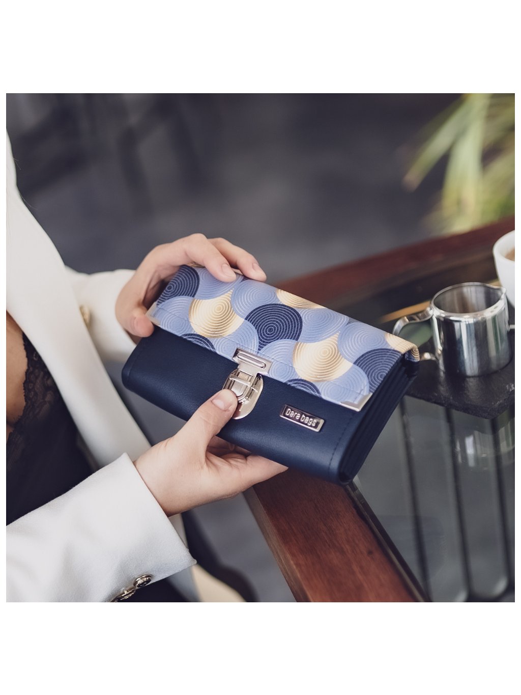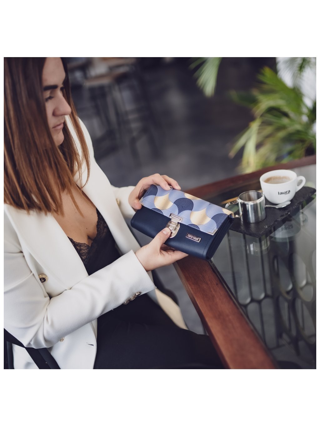 Vnitřní část je navržena jako harmonika. Dvě kapsy na zip, středová tajná kapsa, dvanáct přihrádek na platební a jiné karty. Na zadní straně další zipová kapsička.