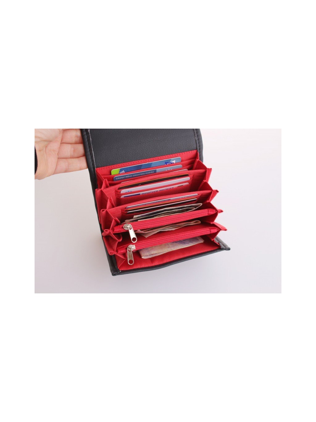 Vnitřní část je navržena jako harmonika. Dvě kapsy na zip, středová tajná kapsa, devět přihrádek na platební a věrnostní karty. Folie na fotografie.