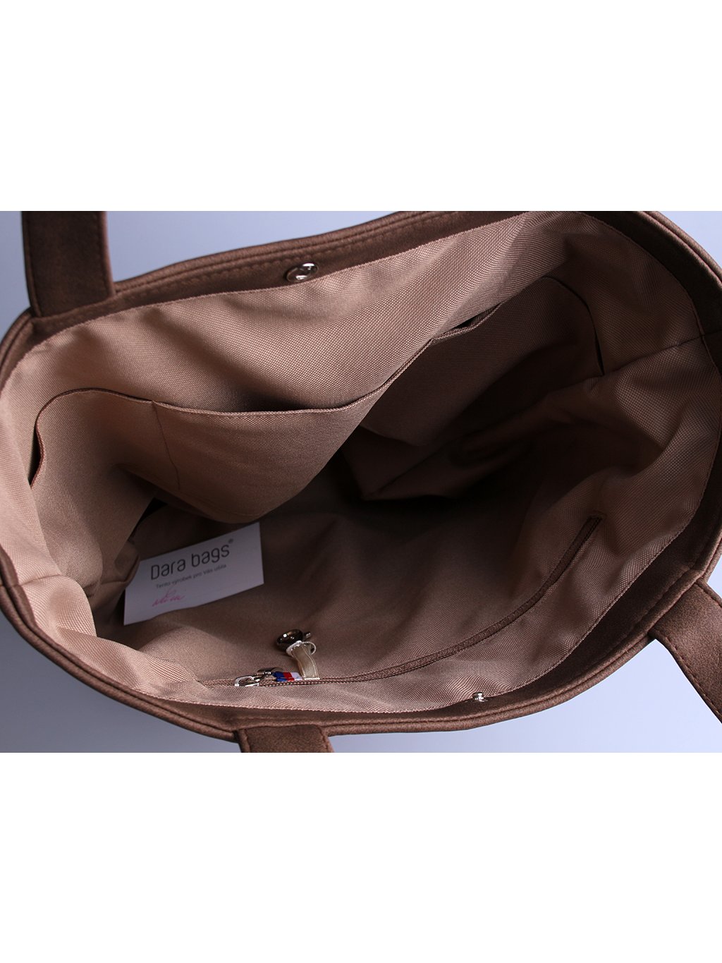 Má pevná a stabilní držátka, dostatečně dlouhá pro nošení na rameni i přes bundu či kabát. Nechybí ani zapínání na druk, uvnitř tři volné kapsičky, jedna kapsa na zip a karabinka na klíče.